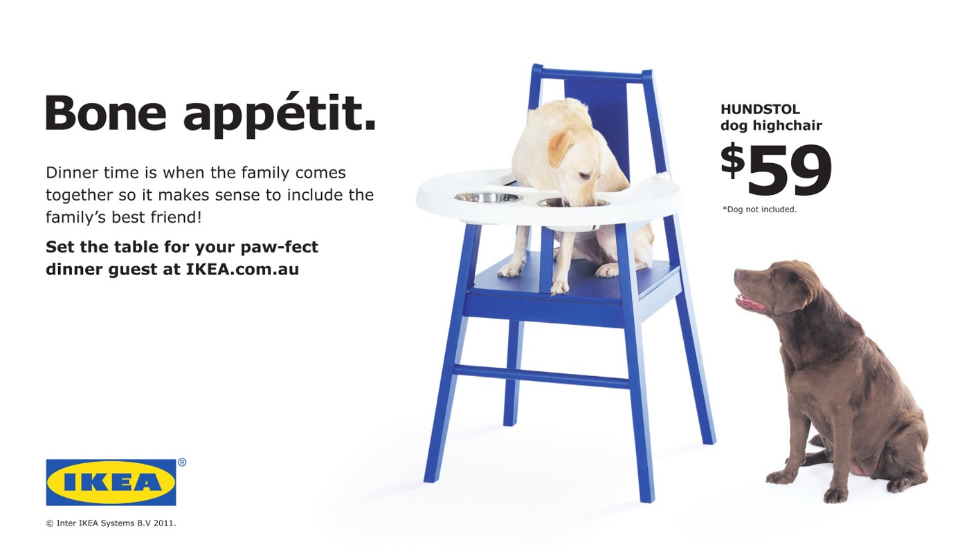 And we could sit here and analyze this ad together for hours, it's so fascinating to me. But there's an Ikea ad with a blue high chair in it. And there is a Labrador, a golden lab sitting up in the high chair, eating, there's two bowls kind of recess down on the highchair, eating from the bowls. And the copy is interesting to me. The copy actually refers to the dogs, as family, right? So dinner time is when the family comes together. So it makes sense to include the family's best friend. So it's interesting, the copy, right? That it refers to the dog that's in the high chair as a family's best friend. And then it also later on in the copy refers to the dog as a dinner guest. These feel very fuzzy to me. They don't feel like solidly family, right? They sound like visitor. Here's a visitor. When this visitor comes, put them in this high chair at your table. It's the image though that's the most striking and really the copy is almost like it's not an afterthought. It's very carefully crafted, but it's not what stands out in this ad. What stands out is that bright blue high chair, bright silver, or shiny silver bowls in it, and that beautiful golden lab sitting in it. And all you see, looking at it, is a child. A best friend doesn't come to a house and get put in a high chair. You don't buy a high chair for your best friend's baby, right? You buy a high chair for a baby that's in your household and then you utilize it to have them at the table with the family. They're not separate from the family, sitting, or anything like it, they're sitting there at the table with the family. They're one of the family. and so I think that that particular ad and, and the high chair being advertised, and it was really interesting to me. And I think too, I will add this. I think too, that the reason the copy seems a little counter to what the image is because families today, even though this idea of a multi-species family, even though that is becoming more accepted, I think it's still stigmatized. So looking at that copy, I think that that was probably the advertiser's way of walking that line real finely and saying to the consumer that doesn't buy into this, "Hey, we're not trying to say anything about, we're not trying to say that this dog's a child", but then also with that image that really stands out saying, "Hey, you guys that see your dog as your child? Look at this product that we have for you!" so it's really interesting to me, just the line walking, very careful psychological kind of analysis that went into that particular ad.